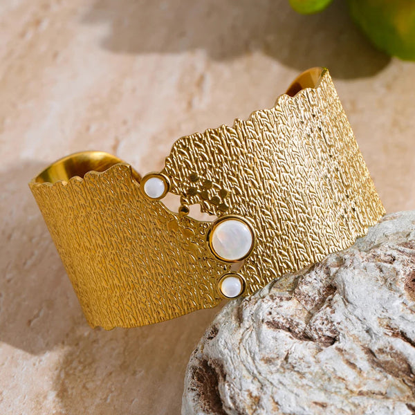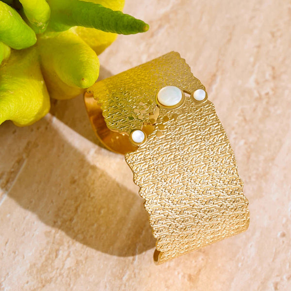 La manchette EVORA est un bracelet large et rigide qui épouse le poignet comme un ornement raffiné. Ornée de fines gravures, il devient à la fois un bijou audacieux par sa largeur et féminin par l’éclat subtil des perles. Un accessoire idéal pour une tenue de soirée ou pour ajouter une touche de sophistication à un look plus simple.